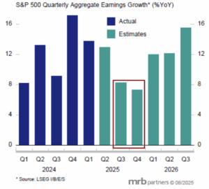 Let’s start with the data. In the second quarter, U.S. corporate earnings grew by nearly 13% year over year, with revenues up more than 6%. Positive earnings surprises in the communication services, technology, and financial sectors accounted for most of the upside; excluding them, earnings growth would have been a modest 2% Y/Y. For the second half of the year, consensus expects high single-digit EPS growth – slightly lower than in previous quarters, as the impact of tariffs begins to bite. Even so, EPS forecasts have been trending higher, supported by resilient results from technology, communication services, financials, and select industrials.