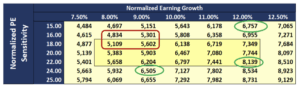 As shown in the table below, the current level of the S&P 500 effectively discounts one of two scenarios: either a normalization of the price/earnings ratio back to 15x while sustaining 12% earnings growth, or a slowdown in earnings growth to 9% while maintaining a 22x P/E multiple. It does not discount a recession (which we also deem unlikely), but neither does it reflect a normalization in both earnings and valuations, an outcome that would imply an index level near 5,000, or a continuation of both at elevated levels (around 8,000).