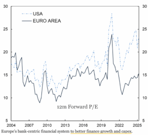 There is, however, some good news. Europe’s private-sector deleveraging phase is largely behind: leverage is down, liquidity is ample, and debt-service metrics are healthy (with France as a notable outlier). Repaired bank balance sheets and improving profitability position Europe’s bank-centric financial system to better finance growth and capex.