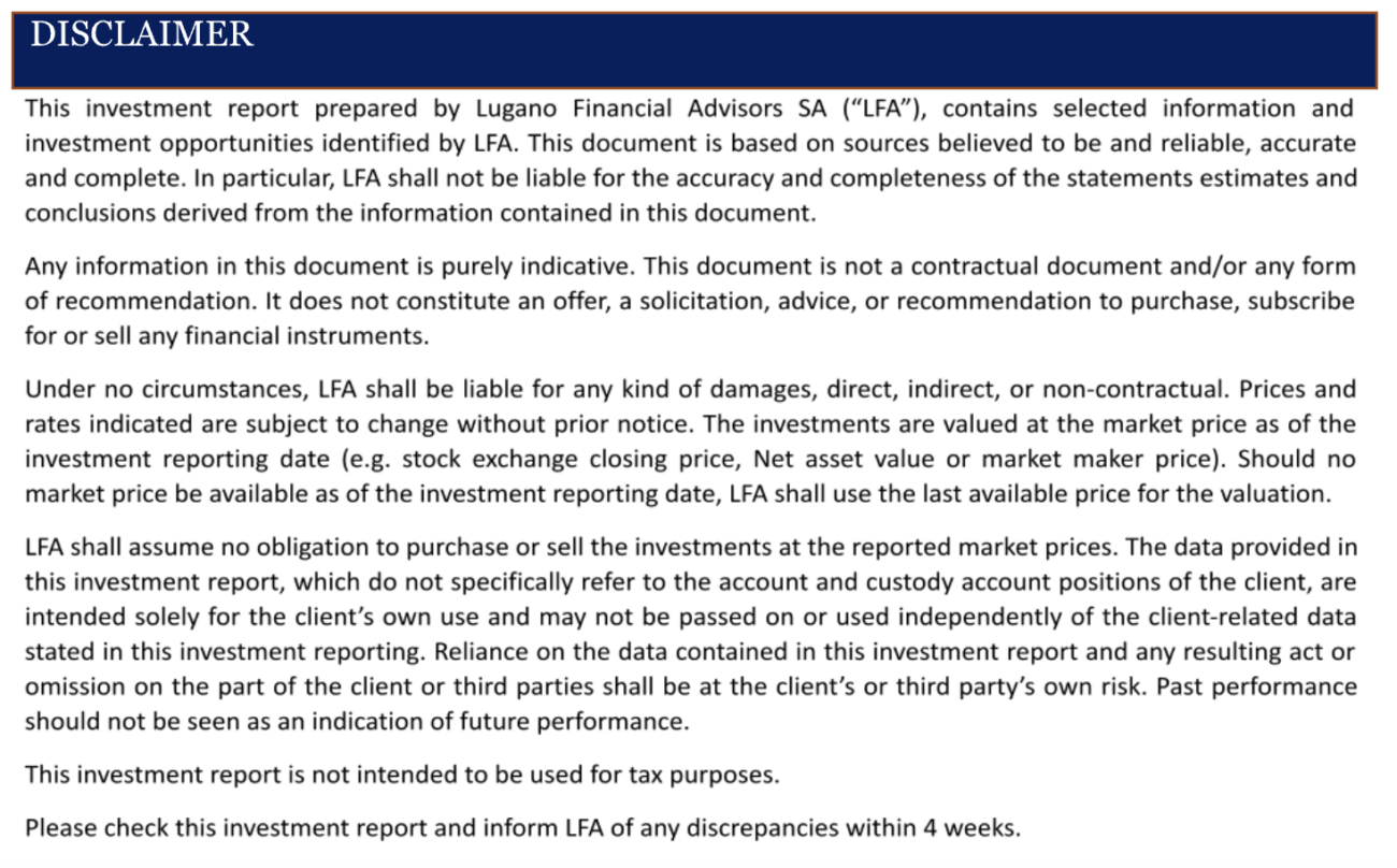 This investment report prepared by Lugano Financial Advisors SA (“LFA”), contains selected information and investment opportunities identified by LFA. This document is based on sources believed to be and reliable, accurate and complete. In particular, LFA shall not be liable for the accuracy and completeness of the statements estimates and conclusions derived from the information contained in this document. Any information in this document is purely indicative. This document is not a contractual document and/or any form of recommendation. It does not constitute an offer, a solicitation, advice, or recommendation to purchase, subscribe for or sell any financial instruments. Under no circumstances, LFA shall be liable for any kind of damages, direct, indirect, or non-contractual. Prices and rates indicated are subject to change without prior notice. The investments are valued at the market price as of the investment reporting date (e.g. stock exchange closing price, Net asset value or market maker price). Should no market price be available as of the investment reporting date, LFA shall use the last available price for the valuation. LFA shall assume no obligation to purchase or sell the investments at the reported market prices. The data provided in this investment report, which do not specifically refer to the account and custody account positions of the client, are intended solely for the client’s own use and may not be passed on or used independently of the client-related data stated in this investment reporting. Reliance on the data contained in this investment report and any resulting act or omission on the part of the client or third parties shall be at the client’s or third party’s own risk. Past performance should not be seen as an indication of future performance. This investment report is not intended to be used for tax purposes. Please check this investment report and inform LFA of any discrepancies within 4 weeks.