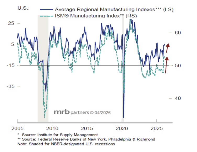 Energy sits at the epicenter of most production processes; higher energy costs translate into higher prices across a vast range of products—from food to fertilizers, from medicines to construction materials. Thus, it is of paramount importance that energy prices normalize soon. Fortunately, the resilience of the U.S. economy has been remarkable, and only a shock could materially weaken it. Manufacturing is improving, as shown by various leading indicators picking up pace and now in expansion territory. It seems we may be past the inflection point; the Federal Reserve (Fed) is on hold, which should be stimulative for the U.S. economy, and many manufacturers have passed through a large part of the tariff-induced price increase (which, in the meantime, has been partially rolled back by a Federal Court). The services sector, on the other hand, has slowed in recent months, but remains above the contraction threshold; therefore, recession probabilities remain in the low to mid-single digits, according to several econometric models, including our own—this, of course, prior to the rise in energy prices.