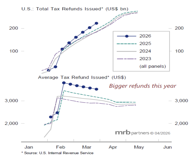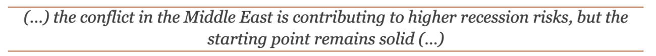 As we were saying, the global economy was in good shape—and still is. The effects of higher energy prices (WTI is in the low 90s $/barrel, off its recent peak but still well above the high 50s $/barrel pre-war), apart from at the gas pump where the reaction is immediate, have only started to come through in recent weeks. It will take several months before higher energy prices fully feed through to the rest of the economy. Should this occur, the global economic outlook could change materially.
