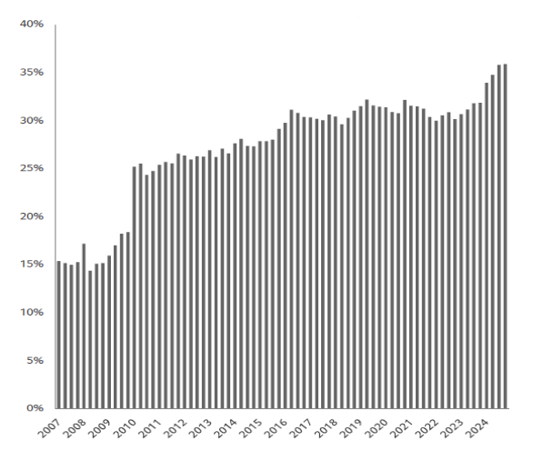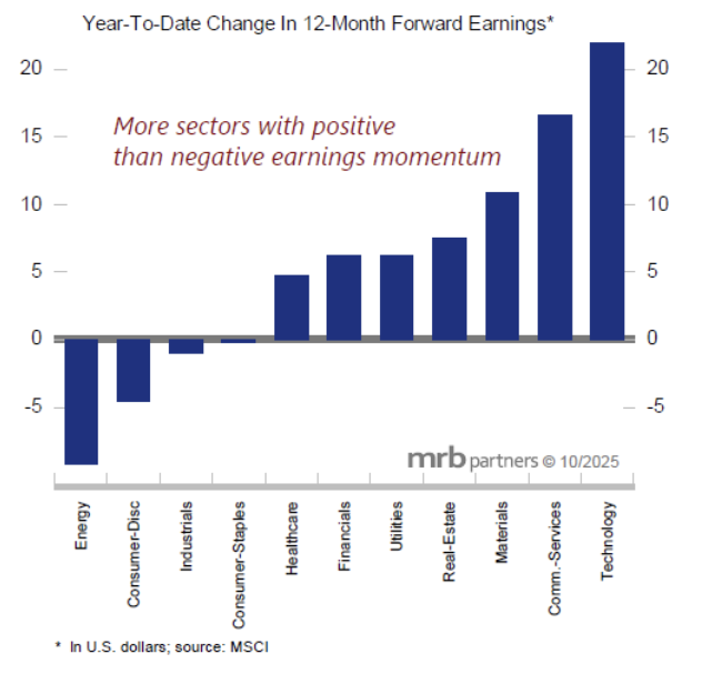 The weaker spot now appears to be the housing market, as affordability issues persist. On the one hand, the combination of stable to mildly declining prices and stable long-term rates supports housing activity, albeit at low levels, leading to improving inventories. On the other hand, declining prices may weigh on activity, with multi-family housing and commercial real estate remaining the most problematic segments—particularly for regional banks, though less so for households.