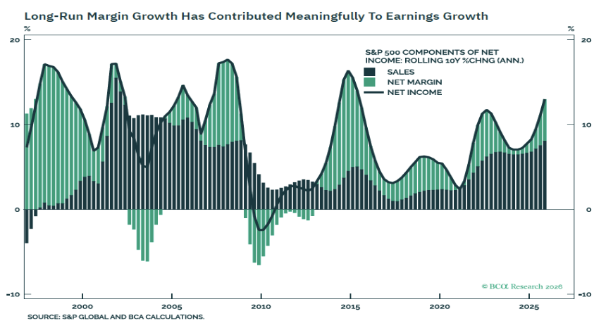 While earnings growth is becoming broader, we still see the Technology sector as remaining at the center of both earnings growth and margin expansion. As a result, the market remains highly concentrated from both a return and earnings perspective; between 60% and 70% of earnings growth is generated by the Technology and Media sectors. This dominance represents both a strength and a risk. As goes tech, so goes the market. Provided that the A.I. theme remains intact, returns should remain supported. At this stage, we see few reasons for the trend to reverse in the near term; incremental profit margins in these sectors approach 50%, compared with roughly 10% for the rest of the market.