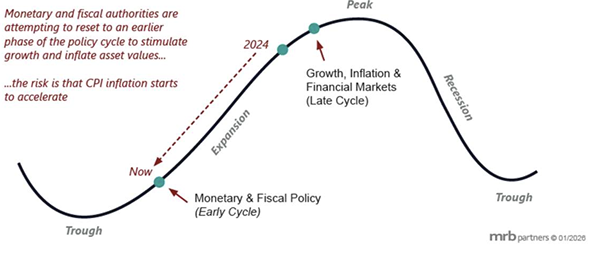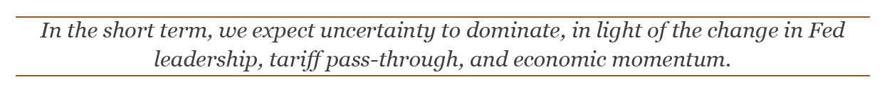 The graph above is a good starting point for the discussion; from the standpoint of growth, inflation, and financial asset values, we are currently sitting close to the peak – the green dot on the far right. Monetary and fiscal policies have always been restrictive in this part of the cycle to allow the economy to cool, the output gap to revert, inflation to return to target, and the labor market to loosen. Yet monetary and fiscal policies are calibrated to achieve the opposite; the Fed has been cutting rates from a peak of 5.5% to the current 3.75% and may cut a further 50 basis points by year-end. The elephant in the room may be the new Fed Chair, who will be announced shortly and will take the helm of the central bank in May; there is a high probability that he will want to please the U.S. administration by easing more than currently expected by financial markets. Similarly, as things stand today, the One Big Beautiful Act (OBBA) is set to deepen the federal government’s fiscal deficit further, although forecasts for the medium term are more difficult to draft given the uncertainty surrounding the impact tariffs could have on public revenues. Admittedly, over the last couple of semesters we have seen some signs of cooling in certain areas of the economy but, in our humble opinion, not enough to justify the current stimulative stance of both the Fed and the government.