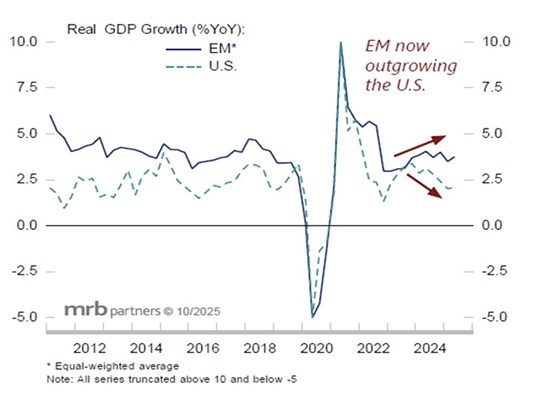 Our concluding remarks are reserved for emerging markets (EM), which staged a strong comeback in 2025, favored by the slump in the U.S. dollar. EM GDP growth has firmed recently, suggesting that the improvement is broad-based (with a few exceptions). For all the talk about the U.S. narrowing its trade deficit with major trading partners, its deficit with EM (excluding China) has widened substantially this year. We believe that tariff exemptions, a lack of domestic alternatives, and a pickup in the U.S. economy may keep demand for EM goods robust.