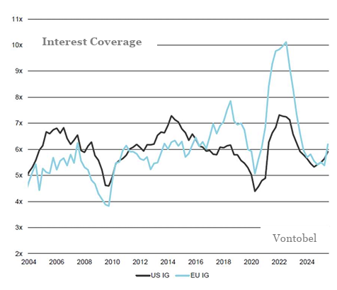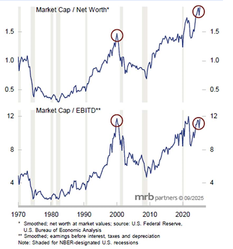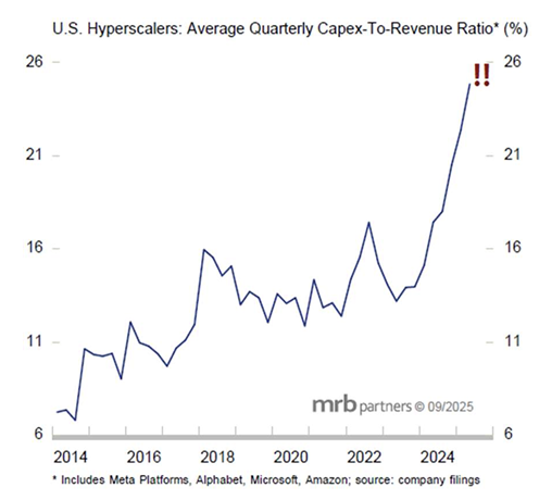 Spending by those players seeking to benefit from the artificial intelligence theme has continued at a massive pace. Microsoft, Amazon, Alphabet, and Meta Platforms, once asset-light businesses, have become more capital-intensive due to their large and growing investments in data centers. The structural increase in the capital intensity of the hyperscalers puts their earnings at greater risk from negative operating leverage should their revenue growth slow. Thankfully, balance sheets remain in extremely good health. Net debt relative to GDP is at its lowest level since the mid-1980s, and during the first half of 2025, net interest and miscellaneous expenses represented just 1.4% of nonfinancial sector debt outstanding, the lowest level since at least the early 1950s. Ergo, exceptionally high spending, even combined with potentially lower earnings, can be sustained from a corporate health perspective; whether equity investors appreciate this, is a totally different story.