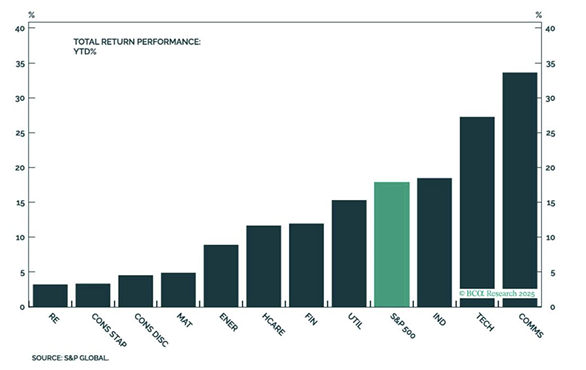 The improving economic outlook is supportive of earnings growth, and the third-quarter earnings season was a case in point. Earnings rose a remarkable 11.6% year over year, while sales increased 8.2%, exceeding the 6.9% and 4.8% expected at the start of the quarter. This represents a modest acceleration from the second quarter but, most importantly, it showed an increase in breadth, with 9 of the 11 sectors posting positive earnings growth. Strong earnings momentum is likely to continue well into 2026; 58% of S&P 500 companies issued positive guidance, resulting in S&P 500 earnings expected to grow by 13.3% over the next twelve months. Technology and media companies may lead the way once more, although expectations are already very high for these two cohorts, raising the bar for positive surprises.